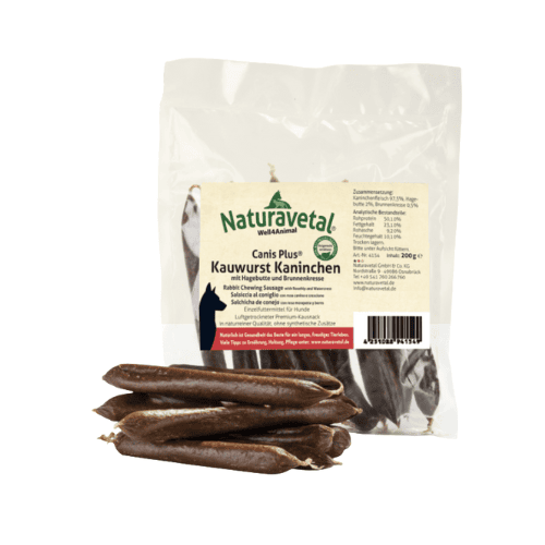 Canis Plus® Rabbit Chewing Sausage with Rosehip & Watercress is a gently air-dried chew to enjoy at home or on a walk, not only excellent for allergy-sufferers but also a special taste experience for gourmets and those aspiring to become one. The hallmark of rabbit meat, is its tender texture and low-fat and low-cholesterol properties.